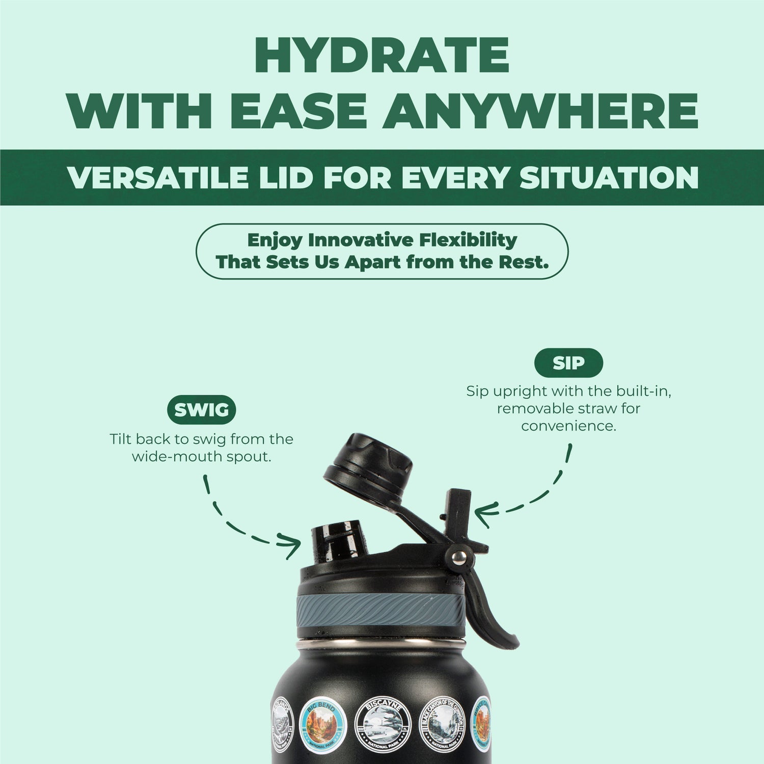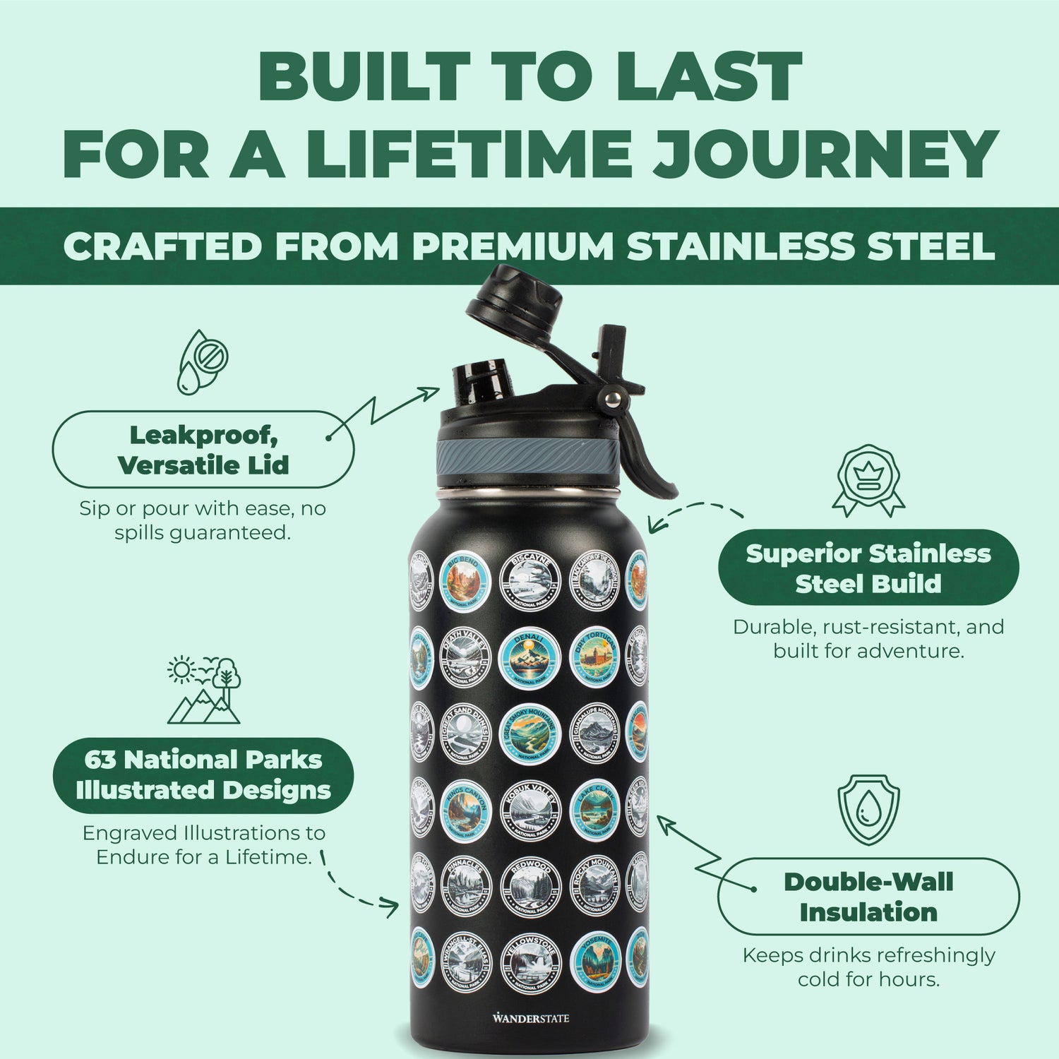 Built for Your Adventures - Made from premium-grade stainless steel, this bottle is built to withstand the rugged terrains of national parks. With advanced leakproof technology, you can toss it in your backpack worry-free, while the double-wall insulation ensures your beverage stays refreshingly cool, just the way you like it.